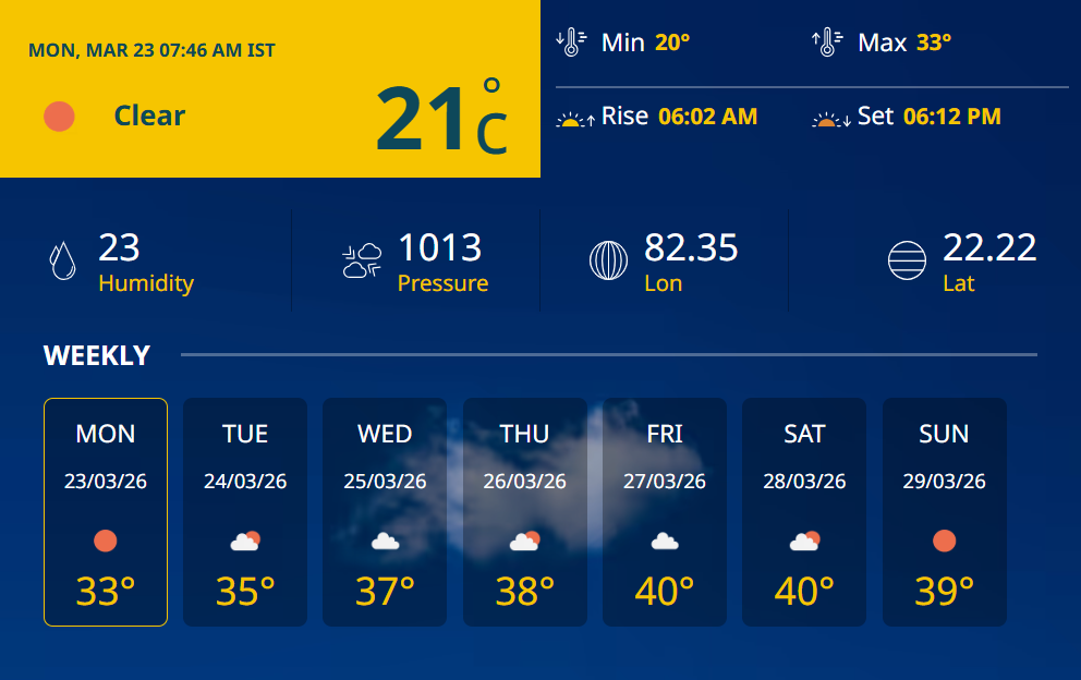 CG Weather Today: छत्तीसगढ़ में आज मौसम का मिजाज सामान्य से थोड़ा बदला हुआ नजर आ रहा है। 23 मार्च 2026 को प्रदेश के कई हिस्सों में हल्की ठंडक के साथ सुबह की शुरुआत हुई, लेकिन दिन चढ़ने के साथ तापमान में बढ़ोतरी दर्ज की जा रही है। मौसम विभाग के अनुसार आज अधिकतम तापमान 33 डिग्री सेल्सियस तक पहुंच सकता है, जबकि न्यूनतम तापमान करीब 20 से 21 डिग्री के आसपास रहने का अनुमान है।