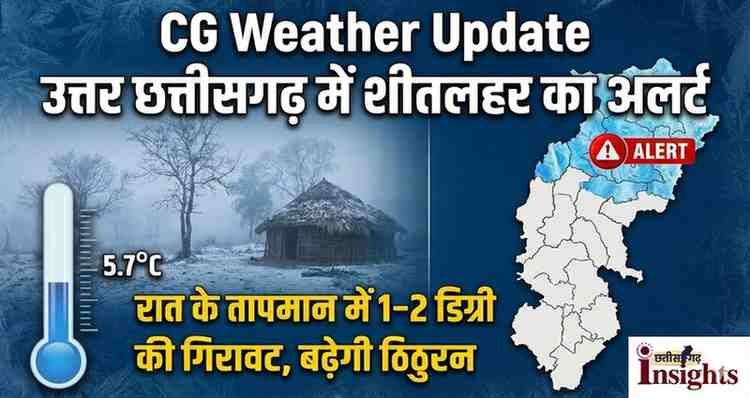CG Weather Update: छत्तीसगढ़ में ठंड का असर लगातार गहराता जा रहा है। उत्तर छत्तीसगढ़ के कुछ जिलों में मौसम विभाग ने शीतलहर को लेकर अलर्ट जारी किया है। आने वाले दो से तीन दिनों में प्रदेश के कई हिस्सों में रात के तापमान में 1 से 2 डिग्री सेल्सियस तक की गिरावट दर्ज की जा सकती है, जिससे सुबह और रात के समय कड़ाके की ठंड महसूस होगी। बदलते मौसम के साथ ठंड से जुड़ी बीमारियों का खतरा भी बढ़ता जा रहा है, जिसे लेकर स्वास्थ्य विभाग ने सतर्कता बरतने की सलाह दी है।