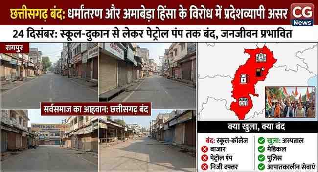Chhattisgarh Bandh News: क्रिसमस से ठीक एक दिन पहले मंगलवार, 24 दिसंबर को पूरे छत्तीसगढ़ में सर्वसमाज के आह्वान पर व्यापक बंद देखने को मिला। कांकेर जिले के अमाबेड़ा क्षेत्र में कथित धर्मांतरण और उससे जुड़ी हिंसक घटनाओं के विरोध में बुलाए गए इस बंद का असर राजधानी रायपुर समेत लगभग सभी जिलों में साफ नजर आया। जयस्तंभ चौक, मालवीय रोड, सदर बाजार, पंडरी जैसे प्रमुख व्यावसायिक इलाकों में सन्नाटा पसरा रहा और आम जनजीवन बुरी तरह प्रभावित हुआ।