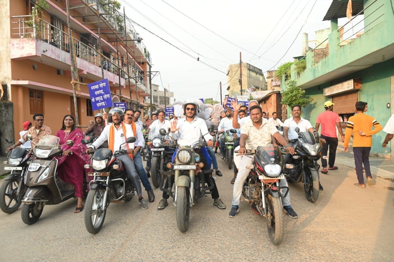 रायगढ़। स्वच्छता ही सेवा पखवाड़ा के तहत शुक्रवार शाम नगर निगम प्रशासन ने स्वच्छता जागरूकता के लिए बाइक रैली निकाली। महापौर जीवर्धन चौहान ने खुद बाइक चलाकर शहरवासियों को स्वच्छ रायगढ़ का संदेश दिया। उनके पीछे बैठे सभापति डिग्री लाल साहू ने “स्वच्छ रहेगा रायगढ़, तो समृद्ध रहेगा रायगढ़” का नारा लिखा बोर्ड थामकर सफाई अभियान को आगे बढ़ाया। आयुक्त बृजेश सिंह क्षत्रिय, एमआईसी सदस्य, पार्षद और निगम के अधिकारी-कर्मचारी भी बड़ी संख्या में रैली में शामिल हुए।